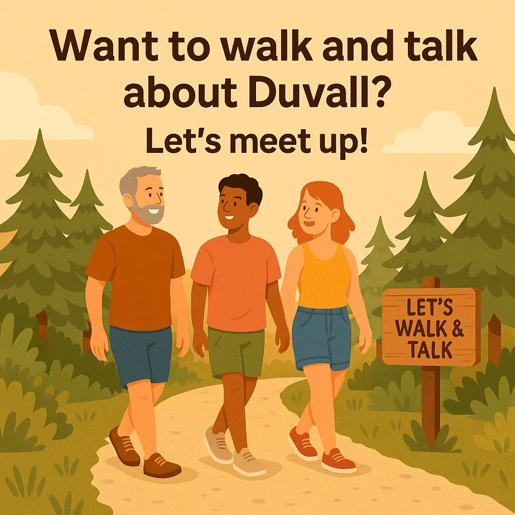 Join Adam for a casual walk through a Duvall neighborhood or park. Whether it’s about the city, the campaign, or just to say hello — you’re invited.